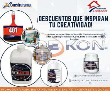 En Materiales Hidalgo, celebramos tus proyectos con un ¡15% DE DESCUENTO increíble en toda la línea de productos DEKON® de 1L y 4L!